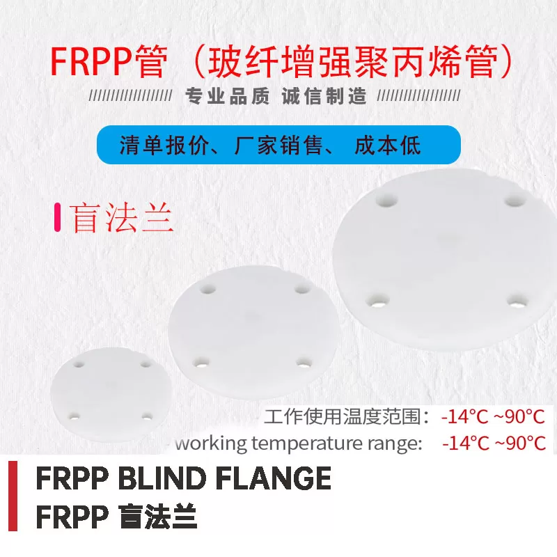 本厂家供应的 FRPP 盲法兰,选用玻璃纤维增强聚丙烯(FRPP)原料加工,采用实心密封的法兰结构,专为 FRPP 管道系统中带法兰接口的端口封堵、管路末端密封设计。其材质延续 FRPP 材料特性,既有良好韧性,法兰盘面受力时不易开裂变形,又具备一定耐腐蚀性,可适配水、轻度腐蚀液体等介质环境,避免管道法兰端口因杂质进入或介质渗漏受损,是 FRPP 管道法兰系统收尾的关键配件。