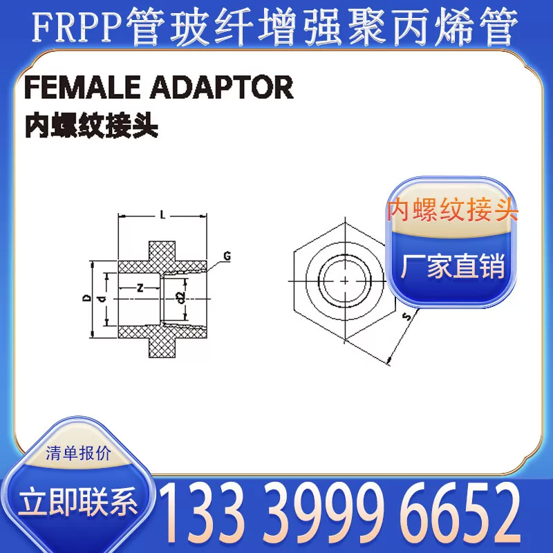 产品使用场景广泛,适用于化工行业轻度腐蚀液体管道螺纹衔接、食品加工行业清水管路仪器对接、市政工程辅助排水管阀门连接、制药厂低浓度溶液管路仪表接口拼接等,能适配室内设备管路或室外浅埋管道安装。目前厂家支持批量批发,价格具备优势,有意采购 FRPP 内螺纹接头的客户,可直接拨打联系方式 13339996652 咨询详情。